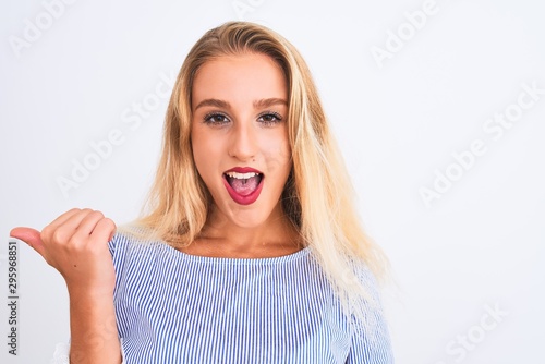 Young beautiful woman wearing elegant blue t-shirt standing over isolated white background pointing and showing with thumb up to the side with happy face smiling