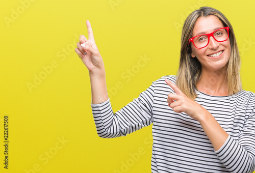Young beautiful woman wearing glasses over isolated background smiling and looking at the camera pointing with two hands and fingers to the side.