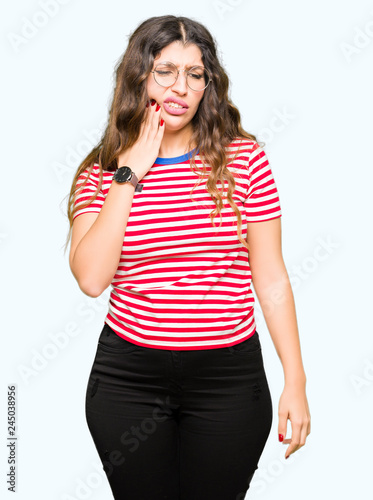 Young beautiful woman wearing glasses touching mouth with hand with painful expression because of toothache or dental illness on teeth. Dentist concept.