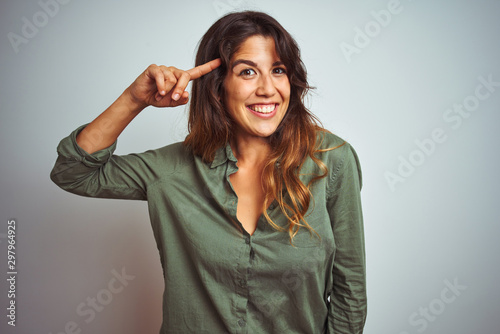 Young beautiful woman wearing green shirt standing over grey isolated background Smiling pointing to head with one finger, great idea or thought, good memory