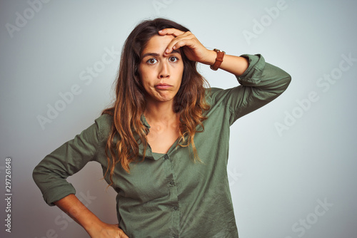Young beautiful woman wearing green shirt standing over grey isolated background worried and stressed about a problem with hand on forehead, nervous and anxious for crisis