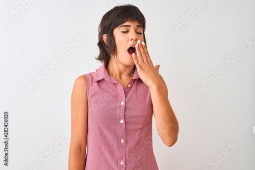 Young beautiful woman wearing red summer shirt standing over isolated white background bored yawning tired covering mouth with hand. Restless and sleepiness.