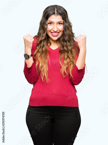 Young beautiful woman wearing red sweater celebrating surprised and amazed for success with arms raised and open eyes. Winner concept.