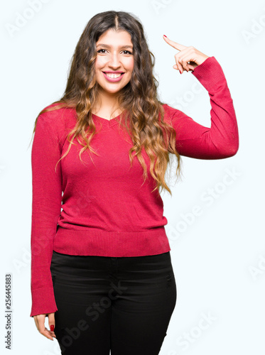 Young beautiful woman wearing red sweater Smiling pointing to head with one finger, great idea or thought, good memory