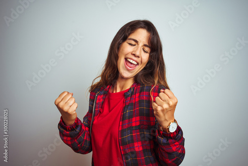 Young beautiful woman wearing red t-shirt and jacket standing over white isolated background very happy and excited doing winner gesture with arms raised, smiling and screaming for success