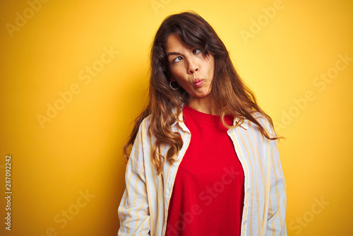 Young beautiful woman wearing red t-shirt and stripes shirt over yellow isolated background making fish face with lips, crazy and comical gesture. Funny expression.