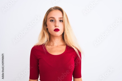 Young beautiful woman wearing red t-shirt standing over isolated white background Relaxed with serious expression on face. Simple and natural looking at the camera.