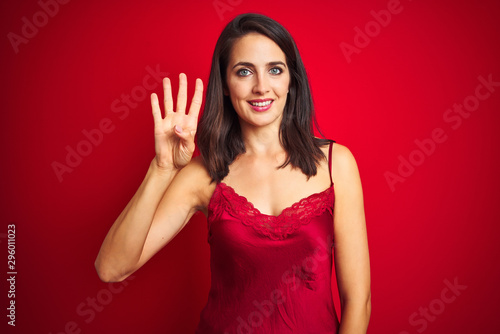 Young beautiful woman wearing sexy lingerie over red isolated background showing and pointing up with fingers number four while smiling confident and happy.