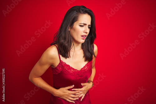 Young beautiful woman wearing sexy lingerie over red isolated background with hand on stomach because indigestion, painful illness feeling unwell. Ache concept.