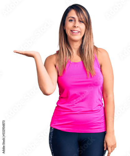 Young beautiful woman wearing sportswear smiling cheerful presenting and pointing with palm of hand looking at the camera.