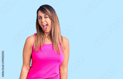 Young beautiful woman wearing sportswear winking looking at the camera with sexy expression, cheerful and happy face.