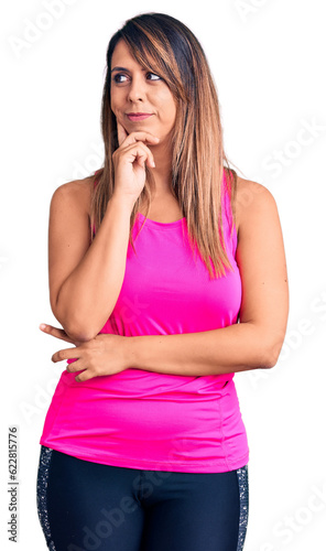 Young beautiful woman wearing sportswear with hand on chin thinking about question, pensive expression. smiling with thoughtful face. doubt concept.