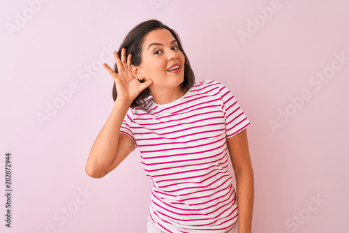 Young beautiful woman wearing striped t-shirt standing over isolated pink background smiling with hand over ear listening an hearing to rumor or gossip. Deafness concept.