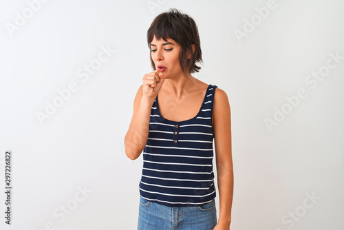 Young beautiful woman wearing striped t-shirt standing over isolated white background feeling unwell and coughing as symptom for cold or bronchitis. Healthcare concept.