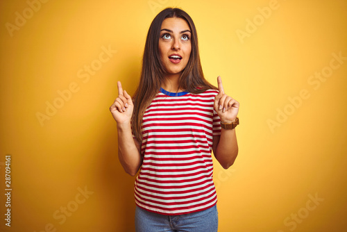 Young beautiful woman wearing striped t-shirt standing over isolated yellow background amazed and surprised looking up and pointing with fingers and raised arms.