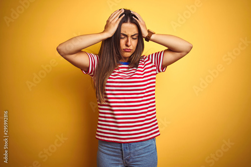 Young beautiful woman wearing striped t-shirt standing over isolated yellow background suffering from headache desperate and stressed because pain and migraine. Hands on head.