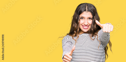 Young beautiful woman wearing stripes sweater approving doing positive gesture with hand, thumbs up smiling and happy for success. Looking at the camera, winner gesture.