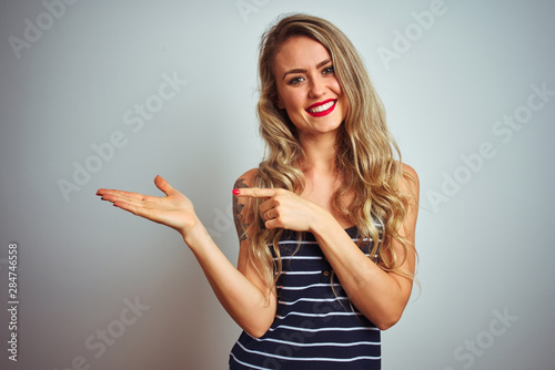 Young beautiful woman wearing stripes t-shirt standing over white isolated background amazed and smiling to the camera while presenting with hand and pointing with finger.
