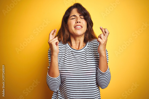 Young beautiful woman wearing stripes t-shirt standing over yelllow isolated background gesturing finger crossed smiling with hope and eyes closed. Luck and superstitious concept.