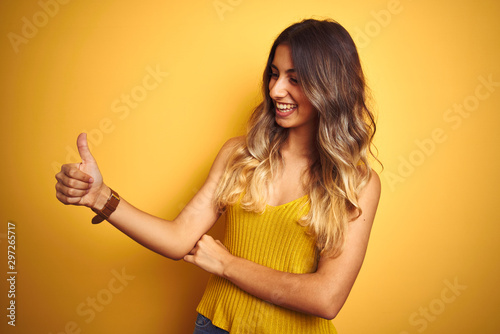 Young beautiful woman wearing t-shirt over yellow isolated background Looking proud, smiling doing thumbs up gesture to the side