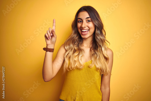 Young beautiful woman wearing t-shirt over yellow isolated background pointing finger up with successful idea. Exited and happy. Number one.