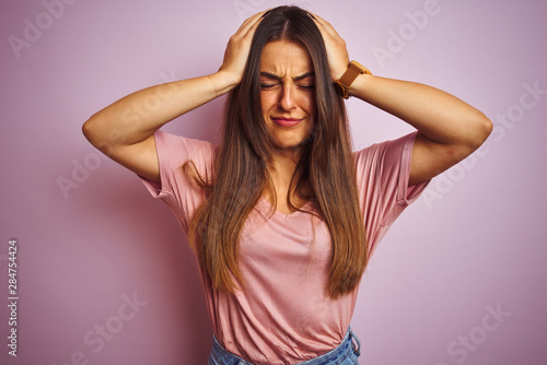 Young beautiful woman wearing t-shirt standing over isolated pink background suffering from headache desperate and stressed because pain and migraine. Hands on head.