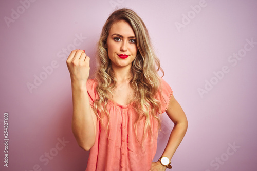 Young beautiful woman wearing t-shirt standing over pink isolated background Doing Italian gesture with hand and fingers confident expression