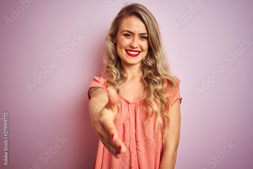 Young beautiful woman wearing t-shirt standing over pink isolated background smiling friendly offering handshake as greeting and welcoming. Successful business.