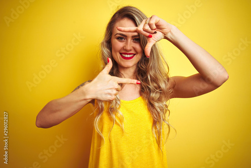 Young beautiful woman wearing t-shirt standing over yellow isolated background smiling making frame with hands and fingers with happy face. Creativity and photography concept.