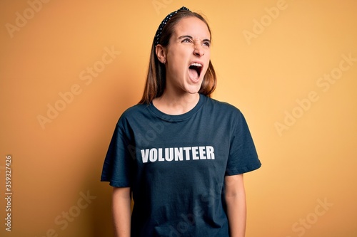 Young beautiful woman wearing volunteer t-shirt doing volunteering over yellow background angry and mad screaming frustrated and furious, shouting with anger. Rage and aggressive concept.