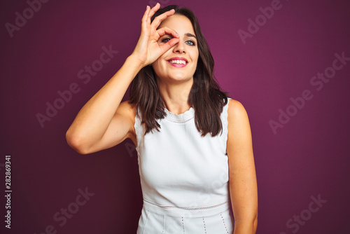 Young beautiful woman wearing white dress standing over purple isolated background doing ok gesture with hand smiling, eye looking through fingers with happy face.
