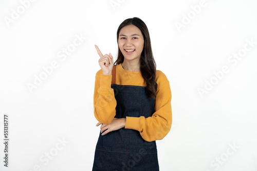 Young beautiful woman with apron standing on isolated white background pointing finger to blank space.