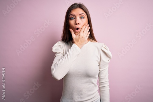 Young beautiful woman with blue eyes wearing casual white t-shirt over pink background Looking fascinated with disbelief, surprise and amazed expression with hands on chin