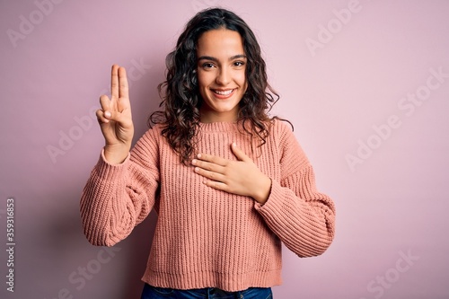Young beautiful woman with curly hair wearing casual sweater over isolated pink background smiling swearing with hand on chest and fingers up, making a loyalty promise oath