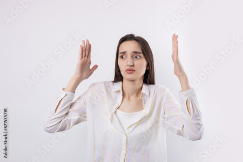Young beautiful woman with facial expression of surprise standing over white background.