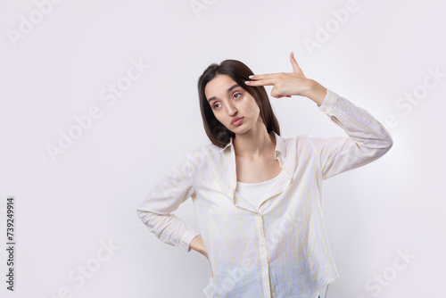 Young beautiful woman with facial expression of surprise standing over white background.