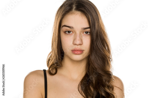 Young beautiful woman without makeup on white background