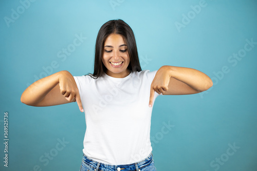 Young beutiful woman over isolated blue background smiling, looking down and pointing down with fingers and raised arms