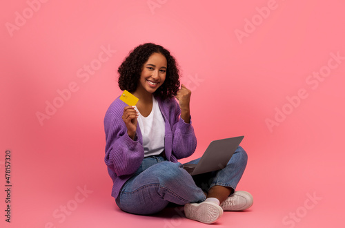 Young black woman with credit card and laptop making YES gesture, excited over big sale in online store, winning lottery