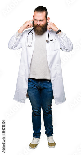 Young blond doctor man with beard wearing medical coat covering ears with fingers with annoyed expression for the noise of loud music. Deaf concept.