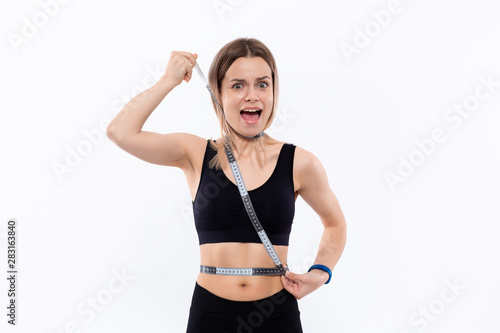 Young blond woman in a black sportswear with smart watches is happy checking waist after workout with the tape measure standing over white background.
