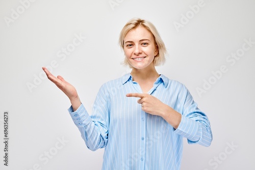 Young blond woman in casual holding something in hand, demonstrating empty space for product or text isolated on white studio background.