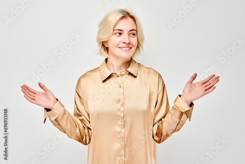 Young blond woman in casual holding something in hand, demonstrating empty space for product or text isolated on white studio background.