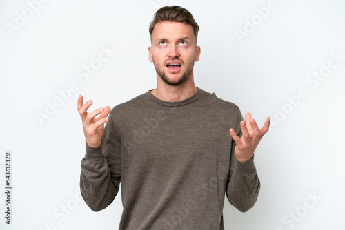 Young blonde caucasian man isolated on white background stressed overwhelmed