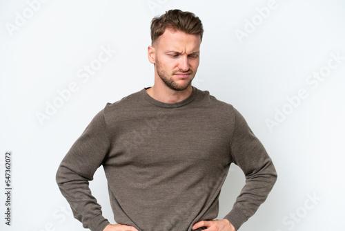 Young blonde caucasian man isolated on white background suffering from backache for having made an effort
