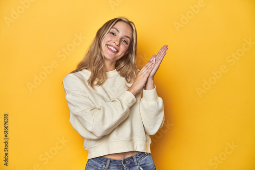 Young blonde Caucasian woman in a white sweatshirt on a yellow studio background, feeling energetic and comfortable, rubbing hands confident.