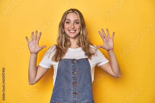 Young blonde Caucasian woman in denim overalls posing on a yellow background, showing number ten with hands.