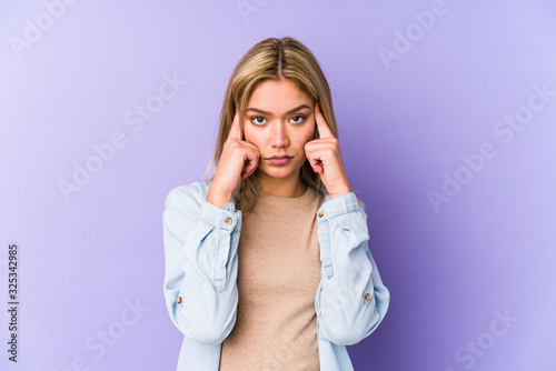 Young blonde caucasian woman isolated focused on a task, keeping forefingers pointing head.