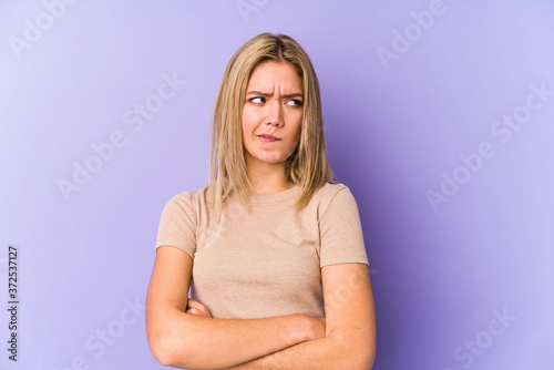 Young blonde caucasian woman isolated frowning face in displeasure, keeps arms folded.