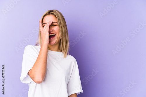 Young blonde caucasian woman isolated laughing happy, carefree, natural emotion.